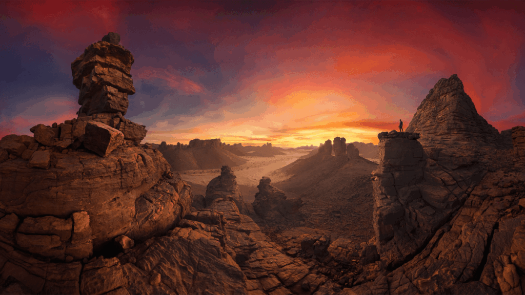 „Poslední ohňostroj“ je celkovým vítězem první kategorie a otevřené soutěže. Při popisu Last Fireworks Wides řekl: „Jak slunce zapadalo, obloha doslova explodovala. Vrstva po vrstvě mraků se rozzářila a kreslila poušť ohněm a zlatem. Pomocí svého Sony A7 IV s objektivem rybího oka na stativu jsem pořídil celou sekvenci více expozic při f/8 a ISO 100, opatrně jsem se otáčel kolem uzlového bodu, abych vytvořil plynulé 360° panorama.“ Obrázek: Alex Wides (Alessandro Cantarelli) / 16. ročník Epson International Pano Awards.